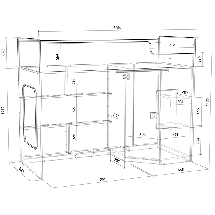 Высота чердака всего 1405мм, что легко позволит взрослым наблюдать за ребенком на кровати или достать что-то с верхнего яруса.