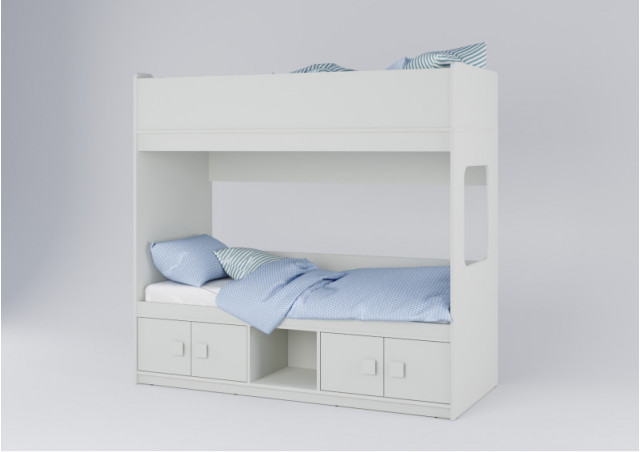 Классическая детская двухъярусная кровать с двумя параллельными спальными местами размером 1750х750 и 1900х750 и закрытыми местами хранения.